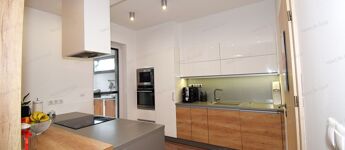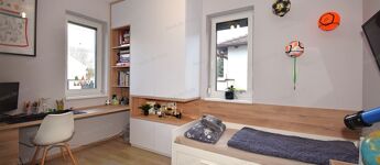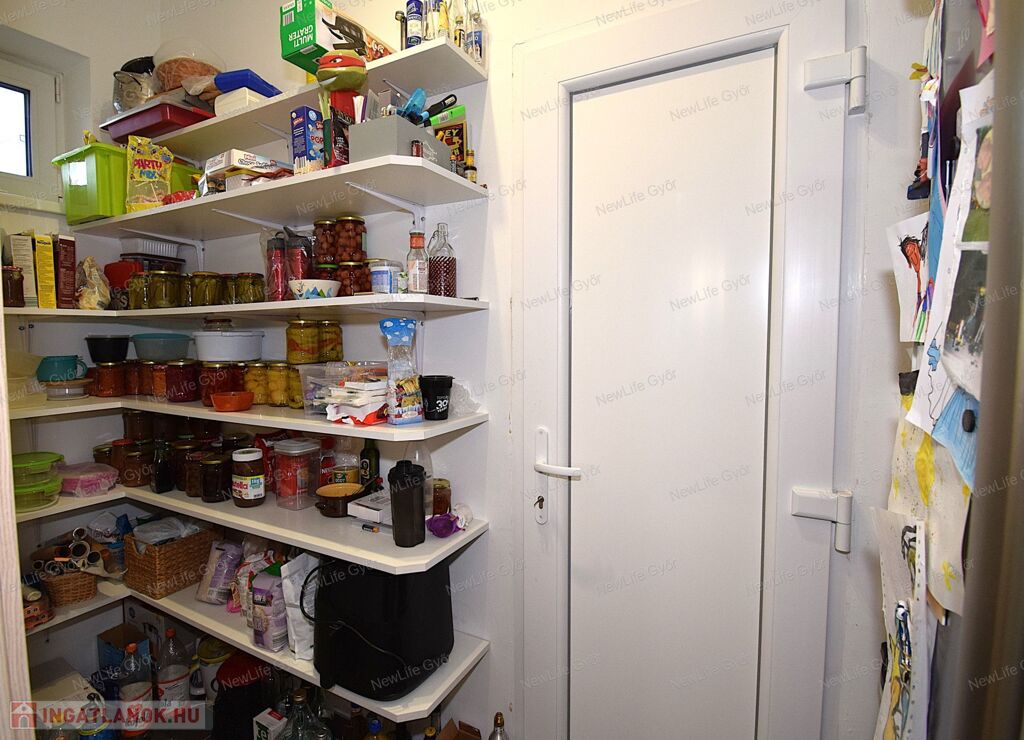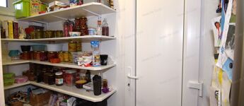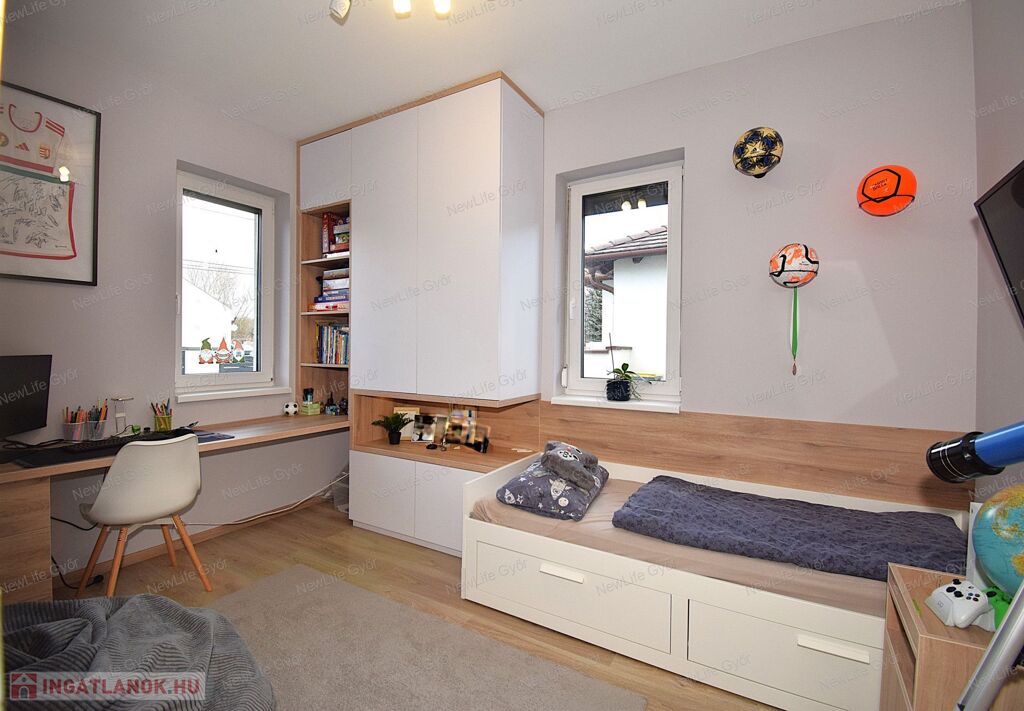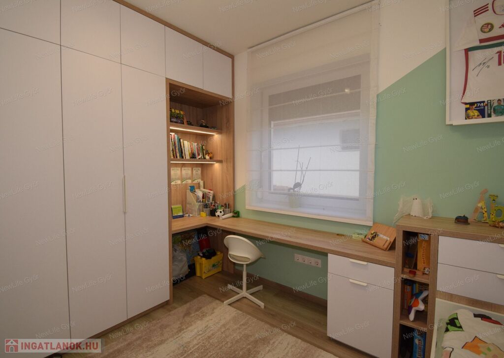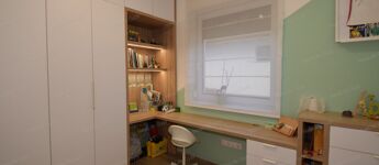 Konyhabútor letisztult, sok fiókos, nagy tárolófelülettel, munkapulttal, gránit mosogatóval, beépített gépekkel (indukciós főzőlappal). Gyerekszobákban asztalosmester által készített beépített bútorok, íróasztalok.