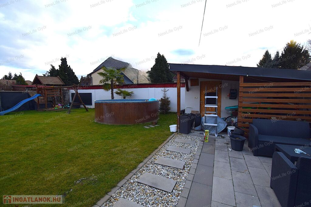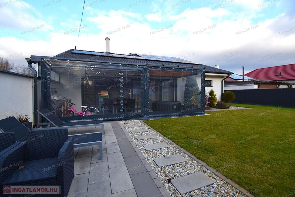 Az udvarban felépült még egy 20 m2-es tároló. Az utcáról nem látni a hátsó udvarba, illetve a terasz is teljesen privát maradt. A félig fixen fedett, félig pergolás megoldással borított, elektromos árnyékolóval szerelt terasz greslappal burkolt, vizes blokk és kinti főzésre is alkalmas pultrész áll rendelkezésre. Télen átlátszó ponyva is leengedhető a csapadék kizárására.
