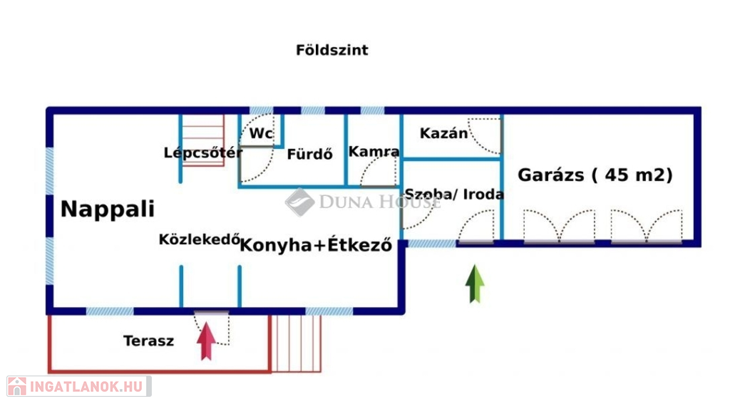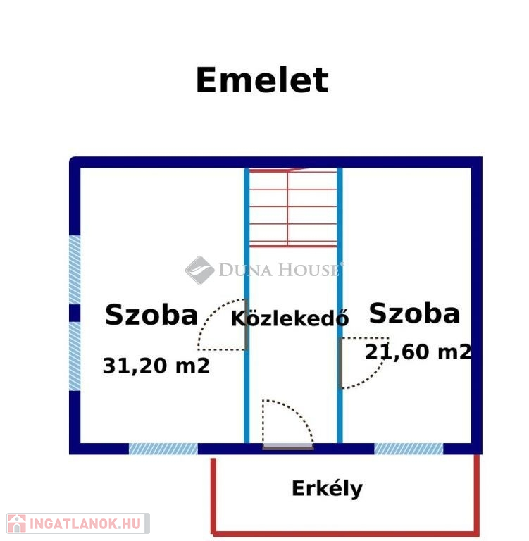Kialakítása földszinten: nappali, konyha+étkező, közlekedő, fürdő+külön wc, kamra, szoba. Emeleten: 2 tágas szoba, erkély, közlekedő