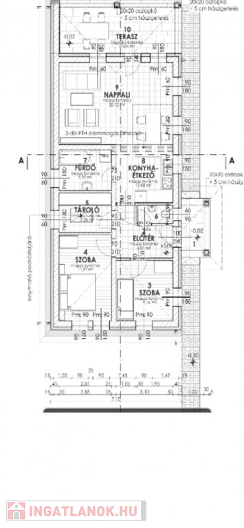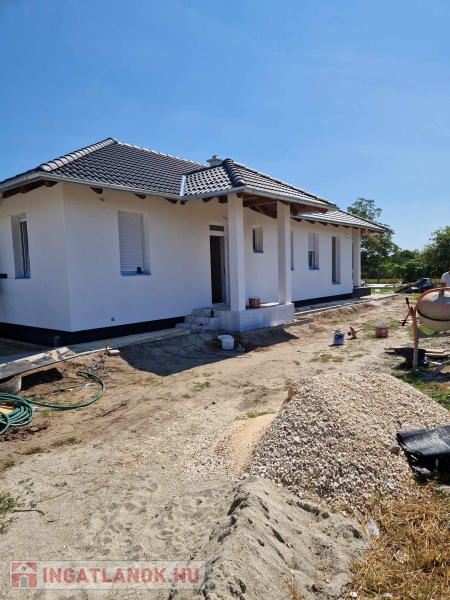 Az épület 74 nm + 15 nm-es terasz. Betonsáv alapra épül, födém felett és tetősíkon hőszigetelés, Porotherm téglából, Fa födémmel, sátor tetővel Terrán betoncserép héjazattal. Lábazati és homlokzati szigeteléssel. A külső nyílásrárők fehér műanyagból készülnek hőszigetelt üvegezéssel. Belső ajtók fából kerülnek 70.000 Ft értékben beépítésre.