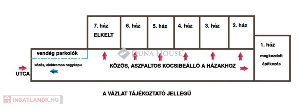 Egy 7 házból álló, lakópark jellegű környezetben épül, közös elektromos kapuval, vendégparkolókkal és aszfaltozott belső úttal. A területen közvilágítás kerül kiépítésre, + minden háznál előkészített kábelezéssel az udvari világításhoz. A 7 házból egy már elkelt, hat még elérhető.