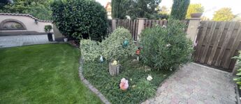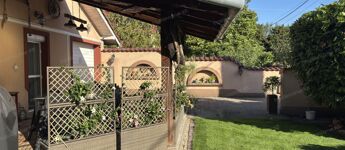 Kényelmes parkolás,garázsban és fedett kocsibeállóban. Szépen rendezett,karbantartott udvar.