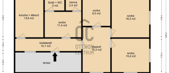 4 külön nyíló szoba, tágas nappali, konyha-étkező, fürdő–WC, kamra, közlekedő és egy kellemes terasz alkotja