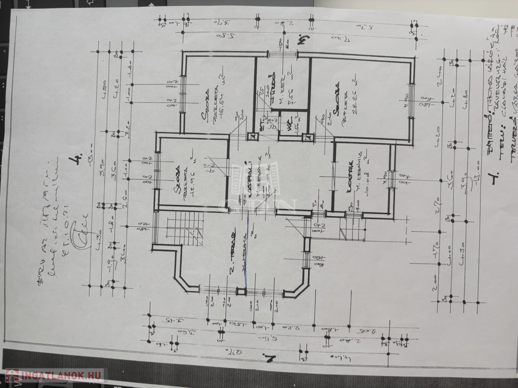 A ház helyiségei az alsó szinten: 4 szoba, konyha, fürdő, WC , háztartási helyiség, az emeleten : 3 szoba, társalgó, fürdő, WC.