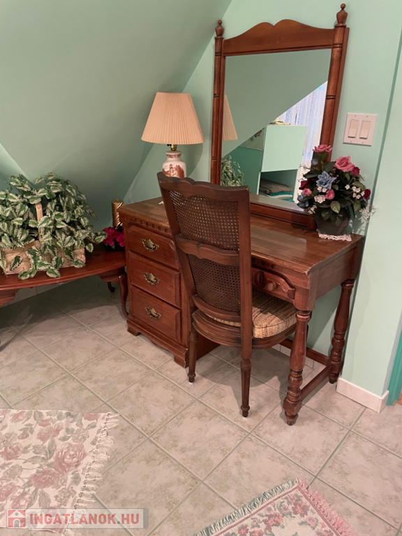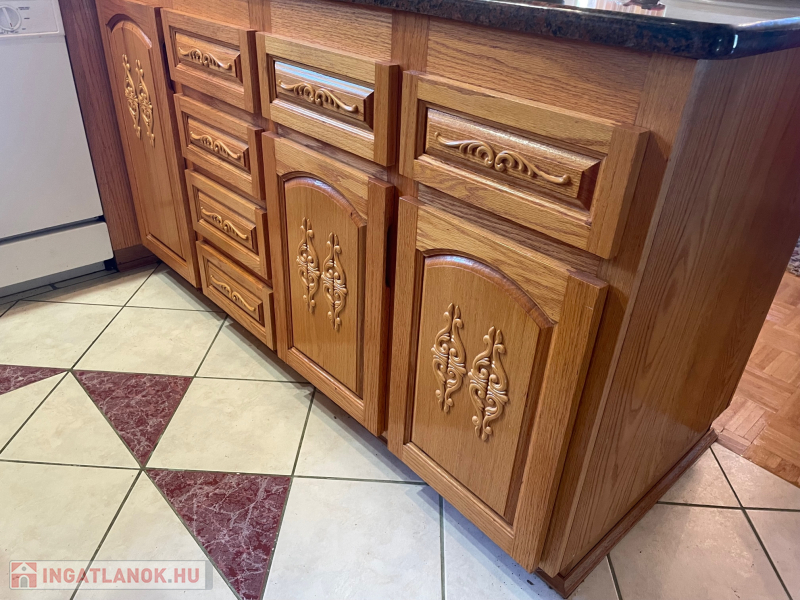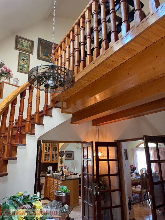 Az egyedi gyártású vörös tölgy konyhabútor és az emeltre felvezető csodás falépcső a tulajdonos keze munkáját dicséri.