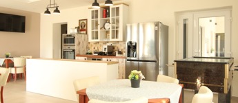 Az emeleten: 4 apartman, egy 52 m2-es társalgó-reggeliző, recepció és személyzeti helység.