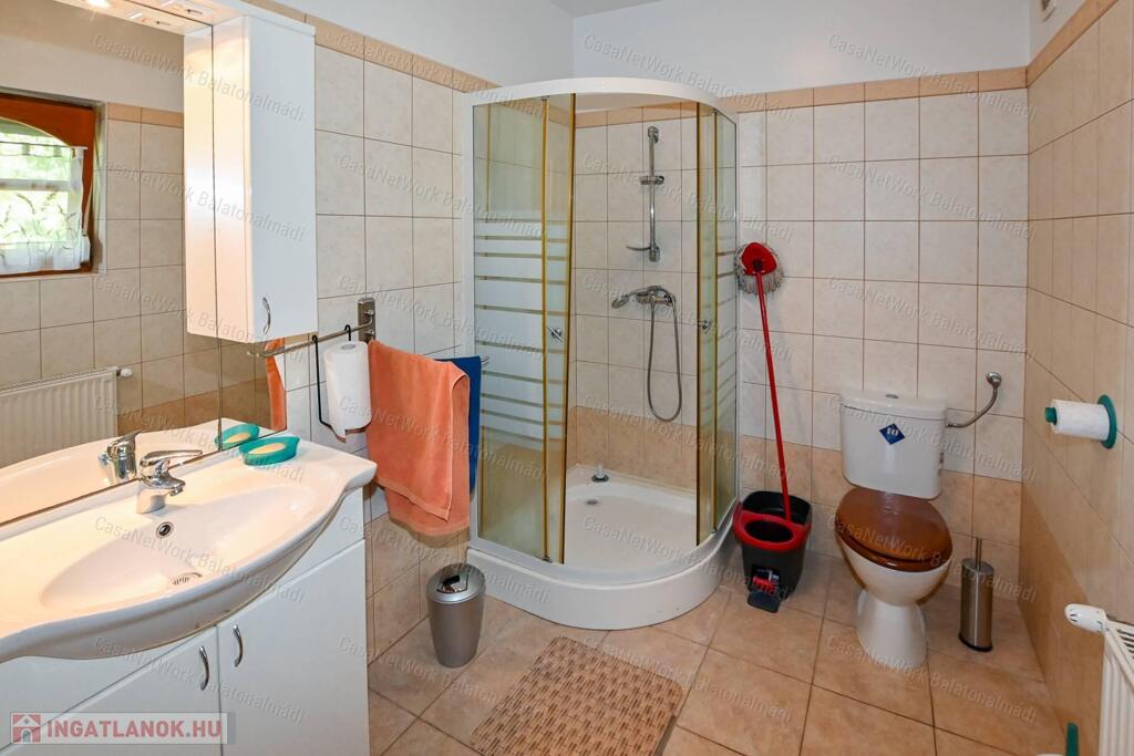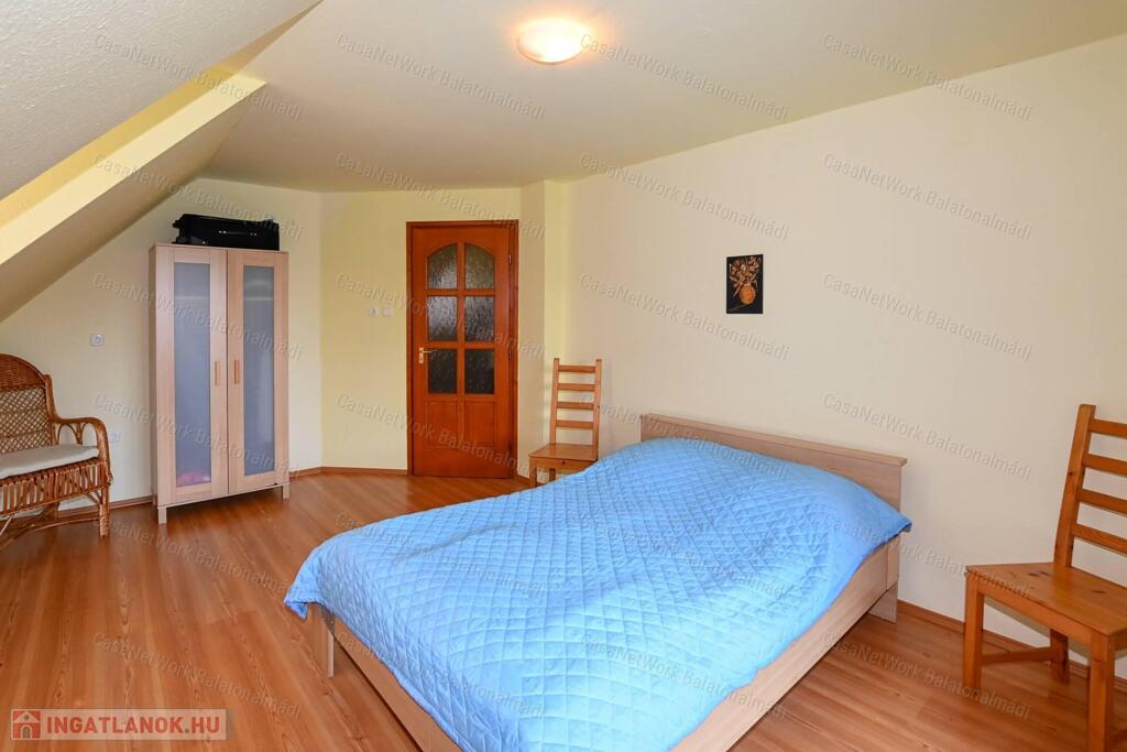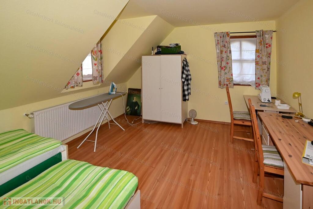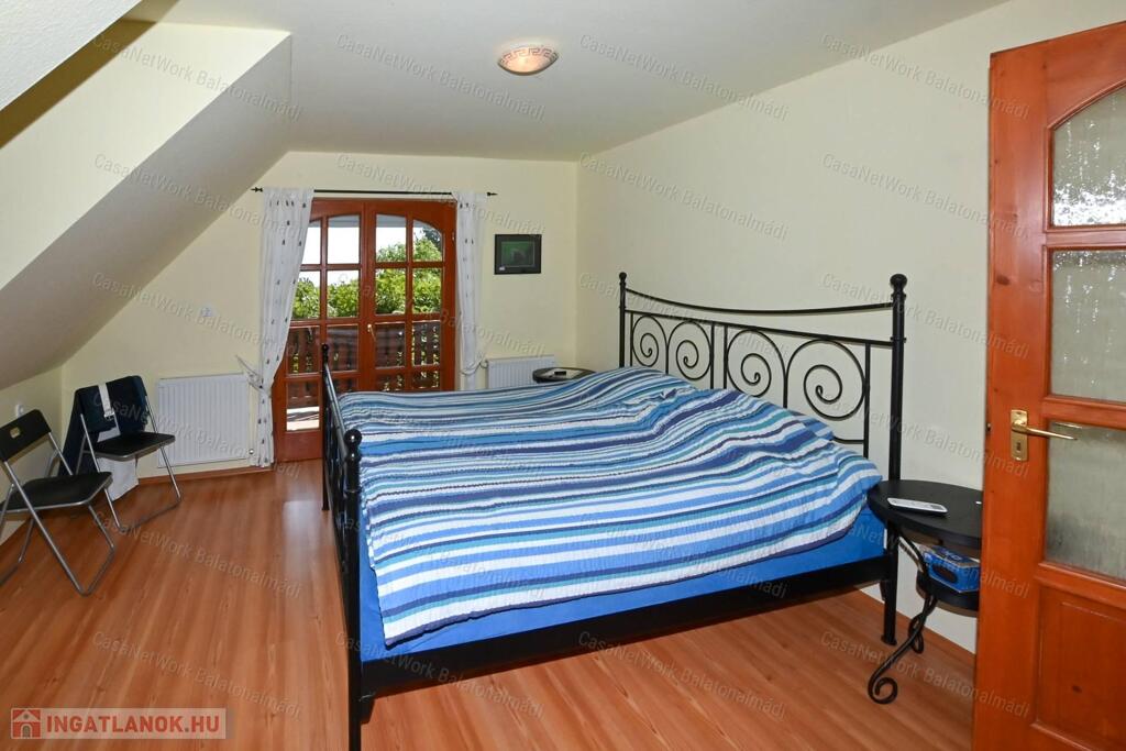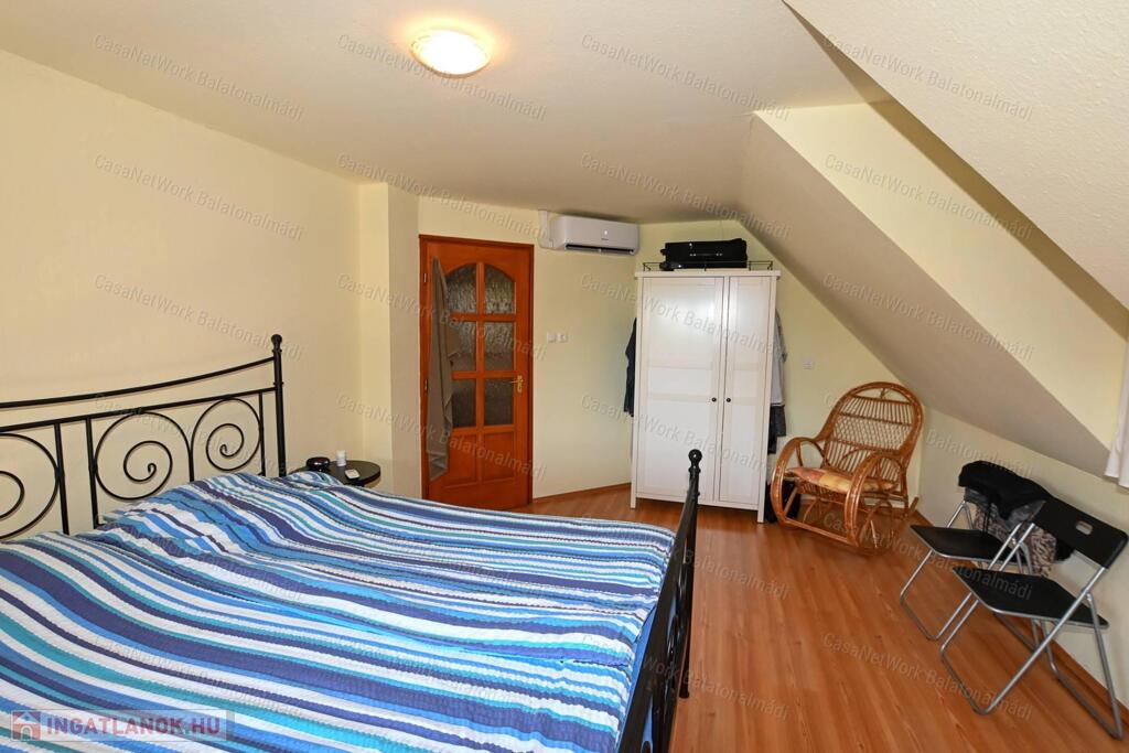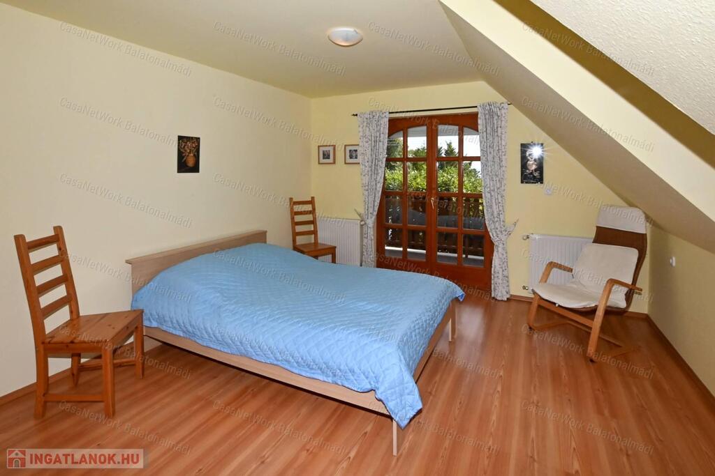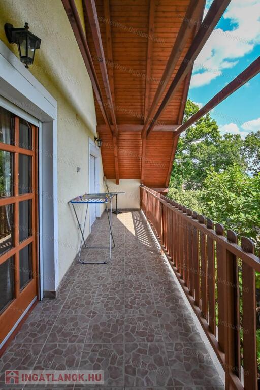 - Az emeletre kényelmes lépcsőn jutunk fel ahol 2 nagy szobát találunk, mindkettőből ki tudunk menni a logggiára, ahonnan rálátás nyílik a Balatonra. Ezen a szinten még egy hálószoba és egy fürdőszoba Wc-vel található.