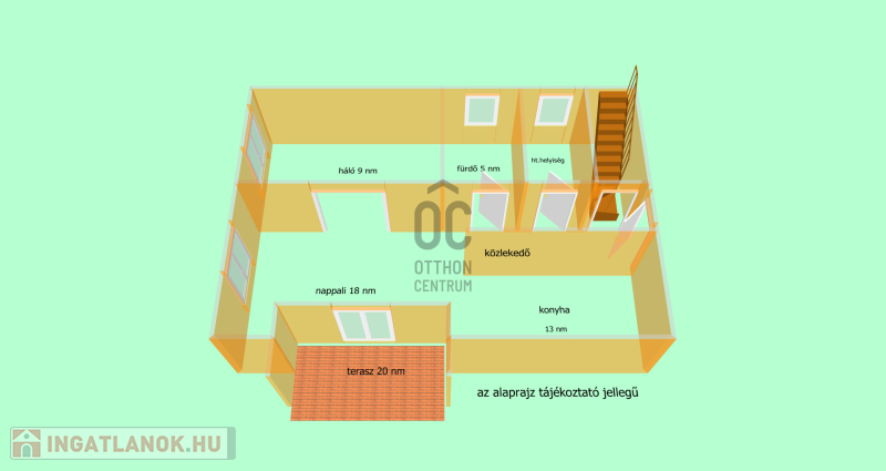 A földszinten nappali-étkező-konyha, hálószoba, fürdőszoba, tároló, közlekedő, lépcsőház található.