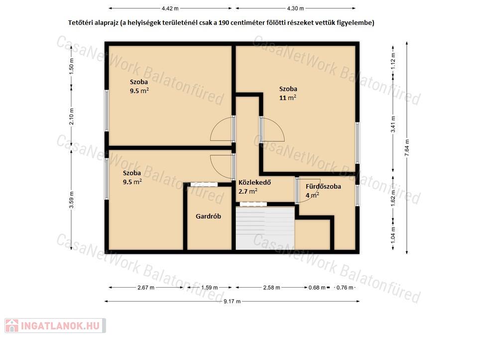 - A tetőtér alapterületébe csak a 190 centiméter feletti részek kerültek beszámításra, így a valóban használható tér ennél nagyobb, mint ami a helysiéglistában fel lett tüntetve, erről az alaprajz ad teljesebb képet.