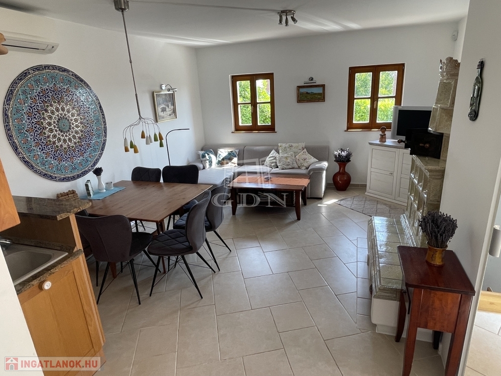 Földszint: nappali + étkező (19,8 m²) + konyha (7,2 m² ) légtérben split klímával, vendégszoba (8,9 m²) + zuhanyzós fürdő (2,4 m²)