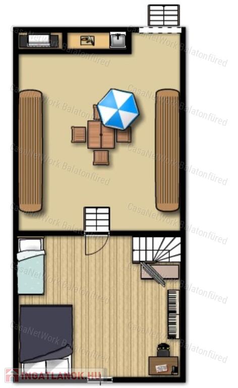 - lakótér 44 m2 , pincéje 22,8 m2, amiből a tároló és a fürdőszoba nyílik