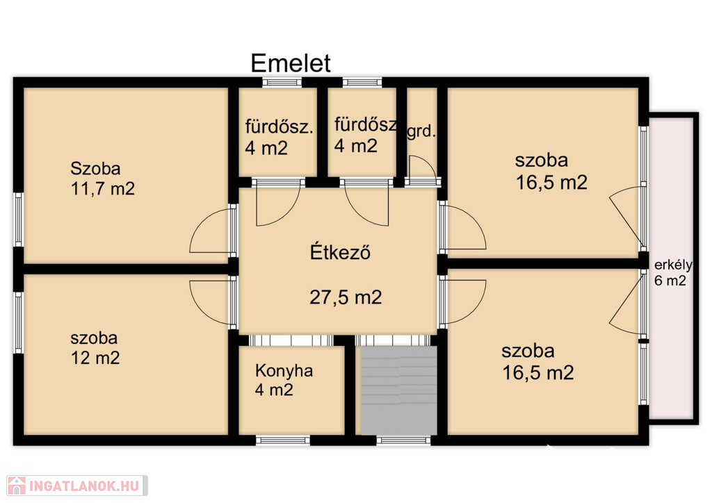 Itt : konyha-étkező, 4 szoba, 2 fürdőszoba , tároló, valamint egy erkély található.
