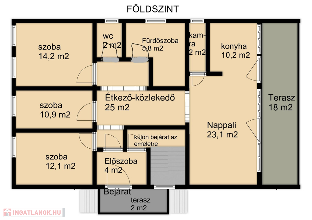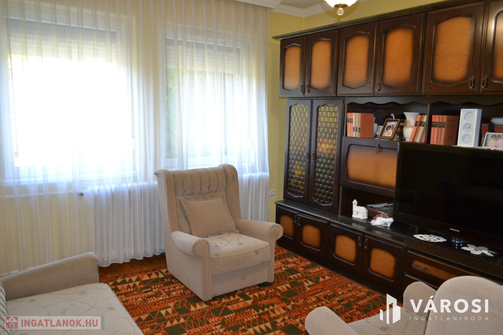 A földszinti lakás külön bejárattal: nappali-étkező-konyha, 3 hálószoba, fürdőszoba, wc, és kamra helyiségekből állnak.