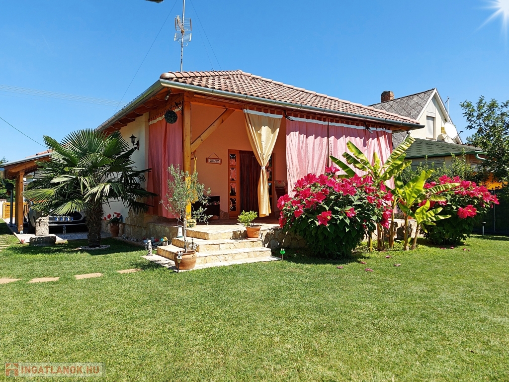 Élvezze a pihenést ebben a lenyűgöző mediterrán stílusú nyaralóban, amely a Balaton déli partjától mindössze 750 méterre kínál kikapcsolódást. A 470 m²-es telekre 2013-ban egy 58 m² -es könnyűszerkezetes ház került megépítésre, az akkori legkorszerűbb technológia szerint, mely számtalan előnnyel rendelkezik a hagyományos építőmóddal épült házakkal szemben. Az épület klímája télen- nyáron rendkívül kellemes, a rezsiköltsége szinte minimális. Az ingatlanba a villany, a víz és a csatorna be van vezetve, a gáz az utcában rendelkezésre áll. A hidegebb napokon egy fatüzelésű kandalló szolgáltatja a kellemes meleget. A kamerarendszer kiépítése megtörtént, az udvar egzotikus növényekkel parkosított, valamint egy grillező hely is kialakításra került. Gépkocsijával egy fedett beállóban parkolhat.
