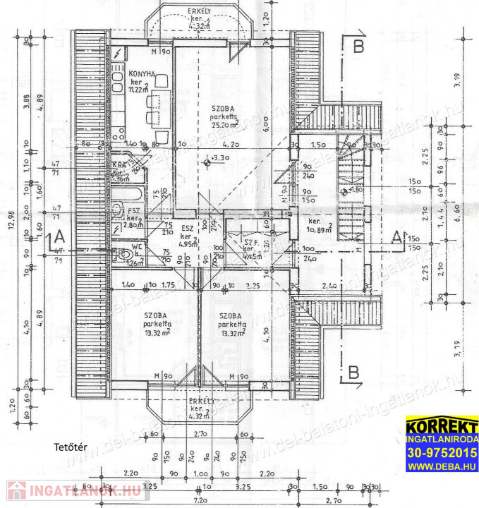 Tetetőtér: 1 apartman: Nappali-konyha, 2 szoba, fürdőszoba, wc, lépcsőház, 2 erkély.