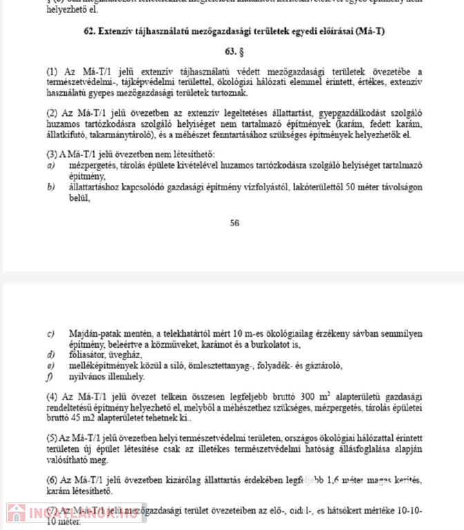 Beépíthetőségét a helyi építési szabályzat nagyban befolyásolja így családi ház, társasház építésére nem alkalmas.