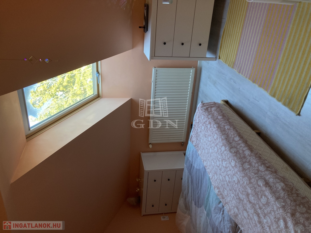 A lakás alsó alsó szintjén két tágas és világos szoba, konyha és étkező, fürdőszoba, vendég mosdó, éegy kisebb gardrób található, az emeleten kettő háló, fürdőszoba, egy hall jellegű előtér és egy jelenleg háztartási szobakén használt helyiség.