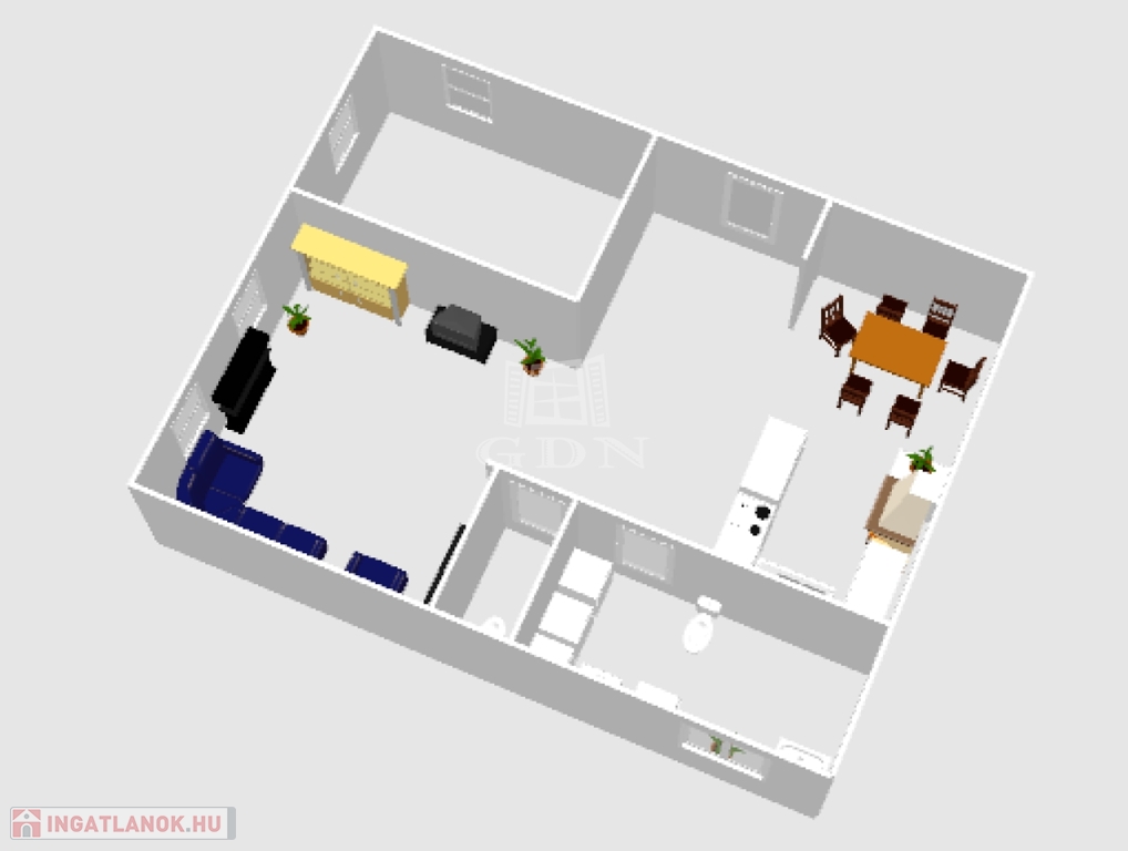 - földszinten: nagy méretű konyha-étkező, nappali és egy szoba,