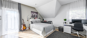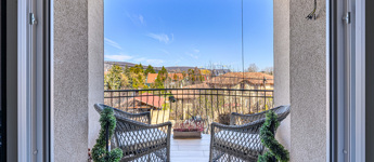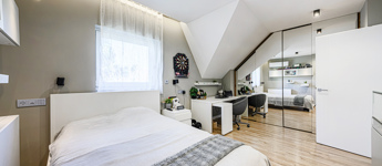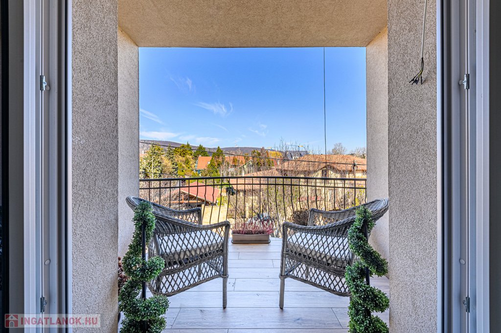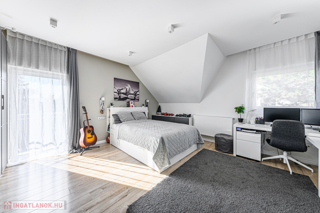 Az EMELETI SZINTEN három nagyméretű hálószoba található, egy elegáns fürdőszobával, amely dupla mosdóval, épített zuhannyal és szabadon álló térkáddal készült, valamint egy külön gardrób helyiség is rendelkezésre áll amit a kert és a Széchényi-hegy felé is kilátást nyújtó erkélyek tesznek hangulatosabbá.