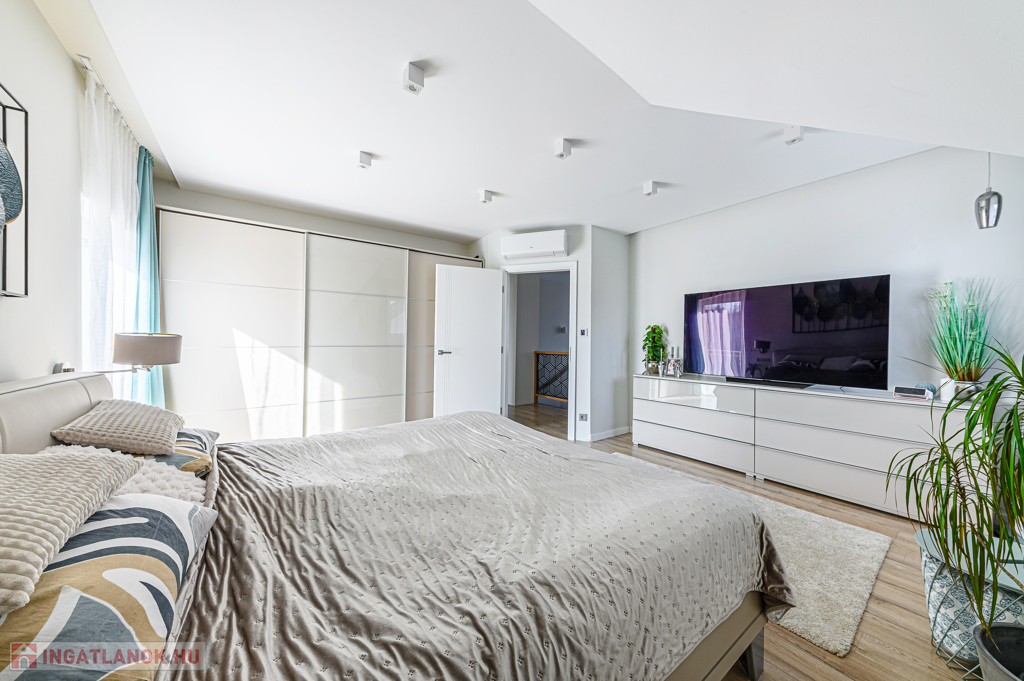 Az épület gépészete korszerű és gazdaságos: Viessmann kondenzációs kazán 200 literes hőtárolóval, padlófűtéssel és radiátoros hőleadókkal, helyiségenként szabályozható vezérléssel. A nappaliban és három hálószobában hőszivattyús hűtő–fűtő klímák biztosítják a komfortos hőmérsékletet, a vízellátást pedig (BWT Perla 50) vízlágyító rendszer egészíti ki. A biztonságról kamerás és riasztórendszer gondoskodik, videó kaputelefonnal.