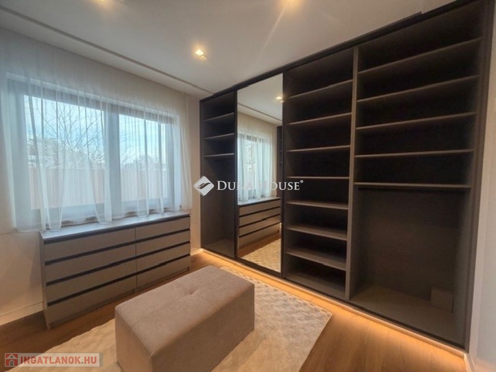 BELSŐ ELRENDEZÉS AZ INGATLANBAN: egyedi méretre tervezett fújt bútorok a gardób szobában, közlekedőben, hálószobában. Német minőségű fújt beltéri ajtók mindenhol. Mészkő párkányok találhatók kívül minden ablaknál.