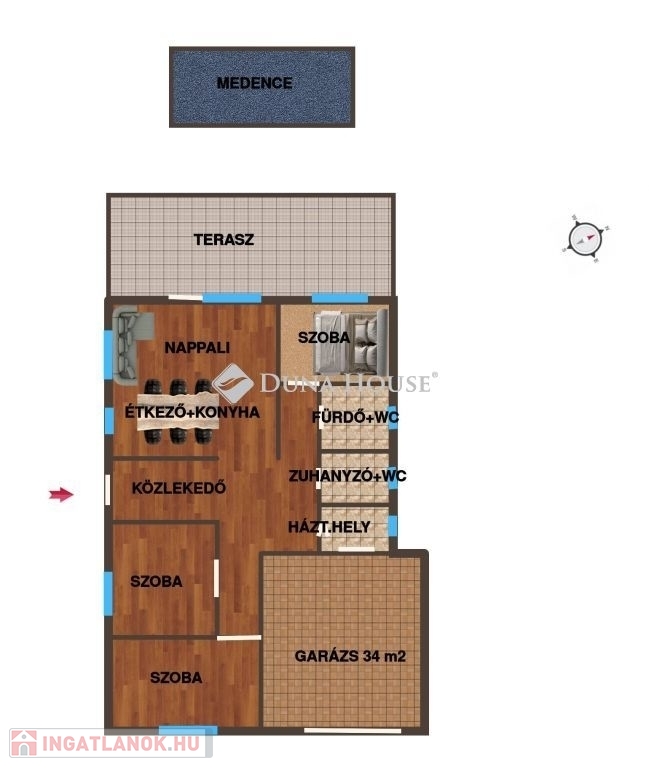 Kialakítása: 3 szoba, tágas nappali+konyha étkező, közlekedő, zuhanyzó+wc, fürdő+wc, háztartási helyiség, 34m2 garázs, 30 m2 terasz.