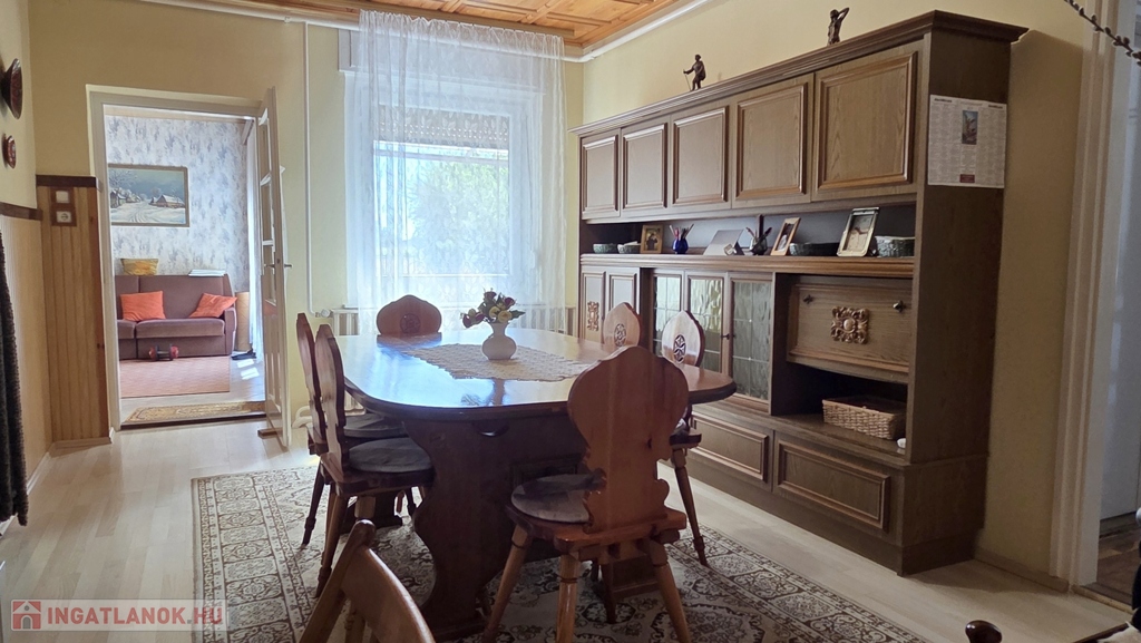 A lakórész egy szintes, 120 nm alapterületű, részben bútorozott, elosztása: előszoba, közlekedő, 3 szoba, konyha, kamra, étkező, fürdőszoba káddal és zuhanykabinnal, külön WC. Az udvar felé fedett terasz.