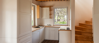 A földszinten tágas nappali–konyha kialakítás, egy hálószoba, valamint egy korszerű gépészeti helyiség található. A modern fürdőszoba káddal, zuhanyzóval és mellékhelyiséggel felszerelt.
