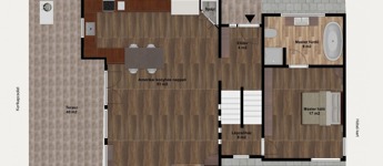 Monolit vasbeton szerkezet, 44 centis Porotherm tégla + hőszigetelő vakolat, az emelet 43, a földszint a félemeleti szobával és fürdővel 122, a pince a vendégszobával 56, a nappaliterasz 40 m2.