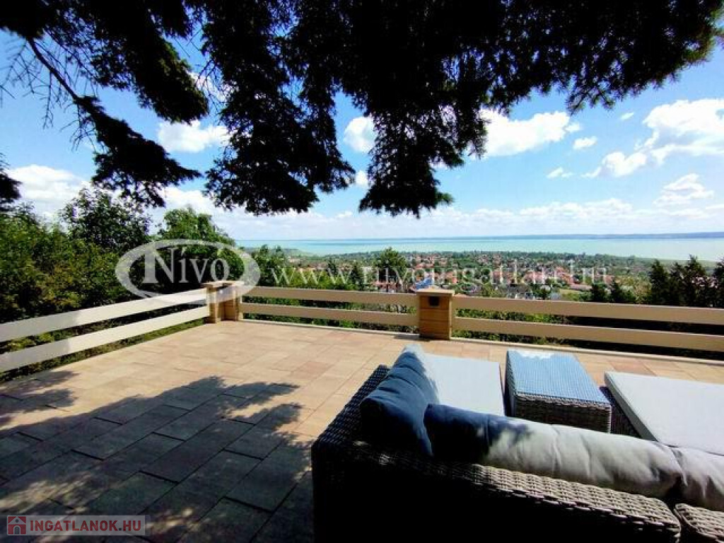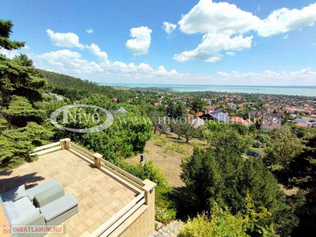 Az épület 517 m2-es összközműves, körbekerített, parkosított, örökzöldekkel beültetett, karbantartott, teraszos kialakítású telken fekszik. A telek minden szintjéről gyönyörű, takaratlan, körpanoráma nyílik a Balatonra. Az ingatlanhoz telken belül 2-3 gépkocsibeálló került kialakításra.