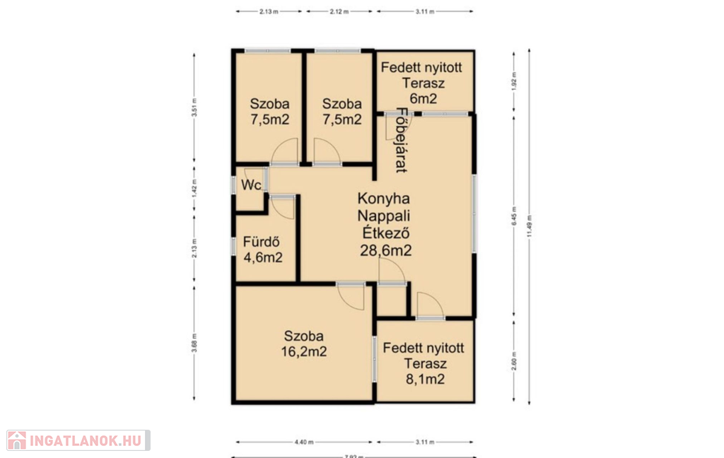 A hirdetésben a 67m2-es alapterület a ház belső mért nettó területe. A teraszok nem kerültek beszámításra. ( 6m2 és 6,2m2)