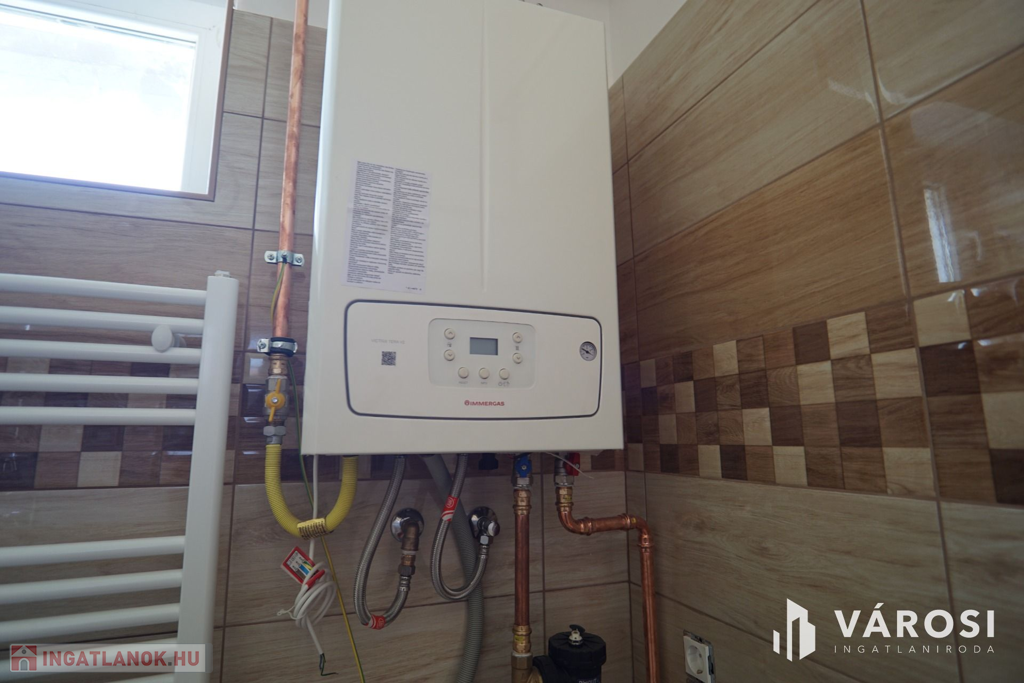 A ház melegét egyedi kombi, kondenzációs gáz cirkó kazán biztosítja, padlófűtés és radiátorok segítségével. A nyári napok lehűtésében klíma segédkezik. (hűtő-fűtő)
