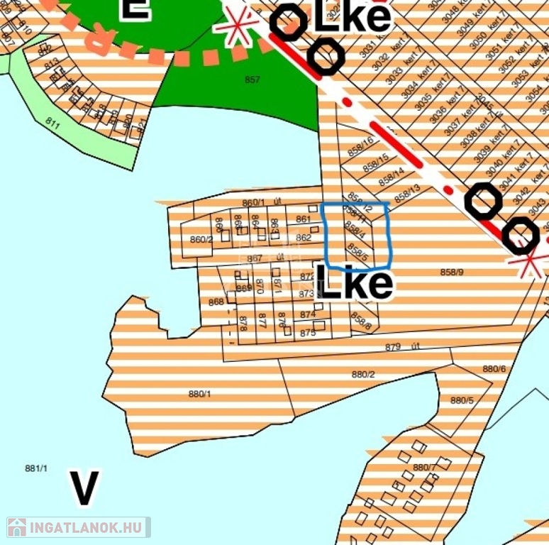 A V-es tó partjától 100 m távolságra található a 2 telek alapterülete: