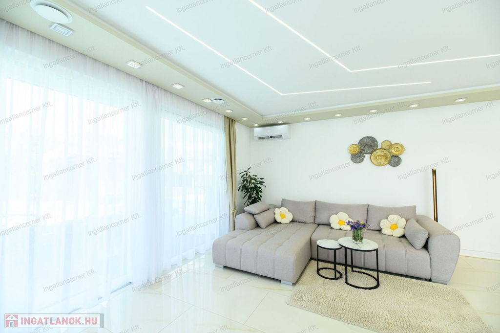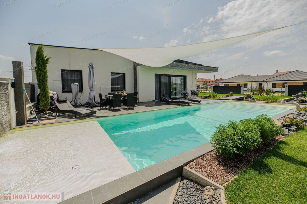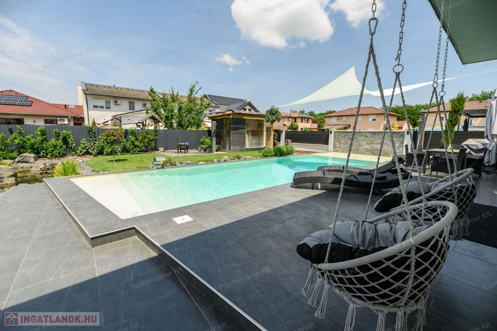Eladó Dunaharasztin egy 2024-ben épült, 1 023 m2-es telken lévő, 135 m2 alapterületű, nappali + 3 hálószobás, nagy teraszos, dupla garázsos, épített medencével, kerti tavacskával rendelkező prémium minőségű LUXUS családi ház!