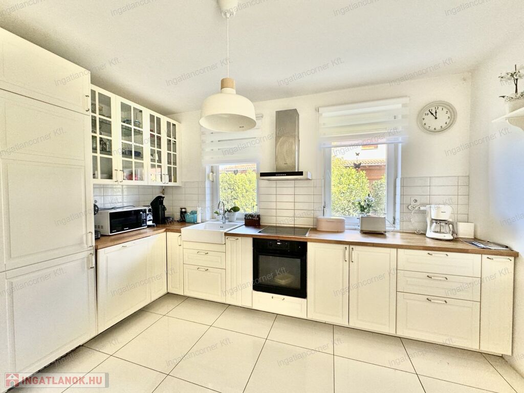 Az ingatlan területére két kapun keresztül is bejuthatunk. A telekre akár több gépkocsinak is lehetősége van beállni. A ház riasztórendszerrel van ellátva. Az ingatlan HATALMAS ablakai a hátsó kertre néznek. Az ablakokon szúnyogháló és redőny található.