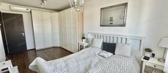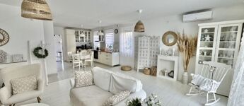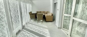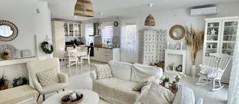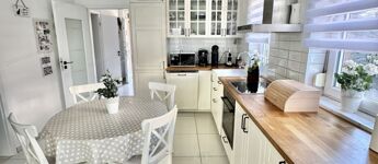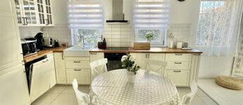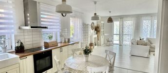 A sok méretes ablaknak köszönhetően NAGYON VILÁGOS a nappali. A konyha felszereltsége: beépített sütő -és főzőlap, beépített hűtő -és mosogatógép. A beépített konyhabútor és a hozzá tartozó teljes felszereltség a vételár részét képezik, ahogy az összes bútor is.