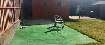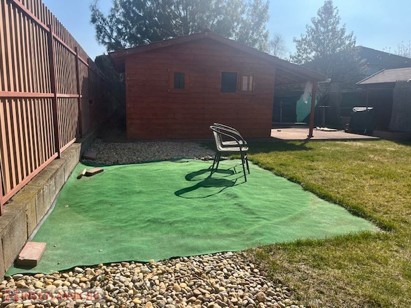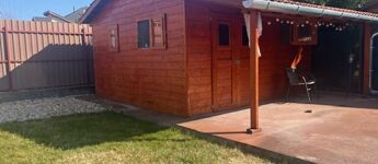 Hátsó parkosított kert felől 21,50 nm terasz, kertben beton alapon 16 nm faház nagy előterasszal található.