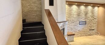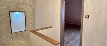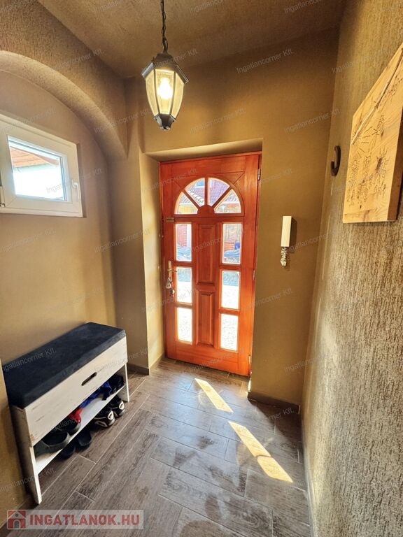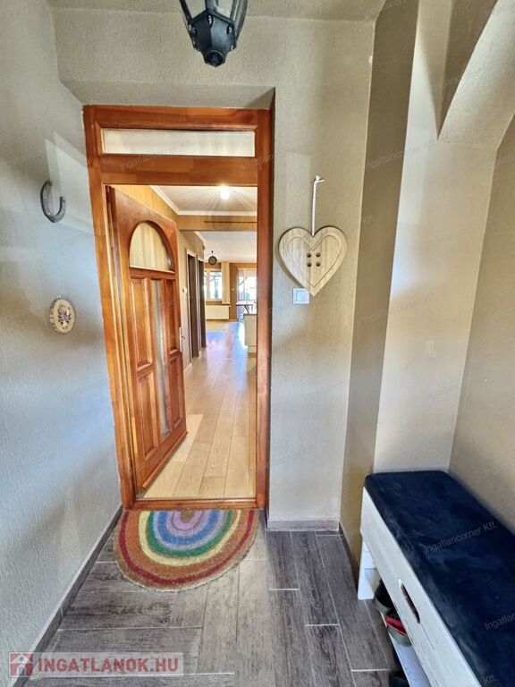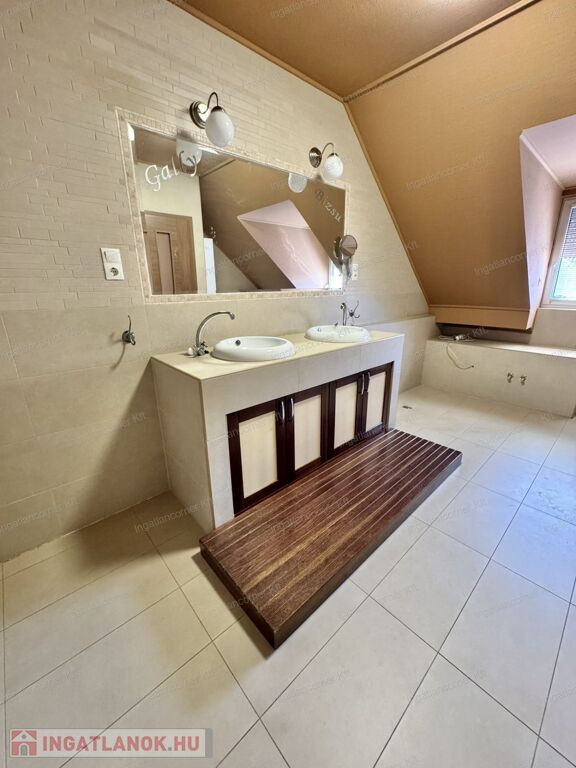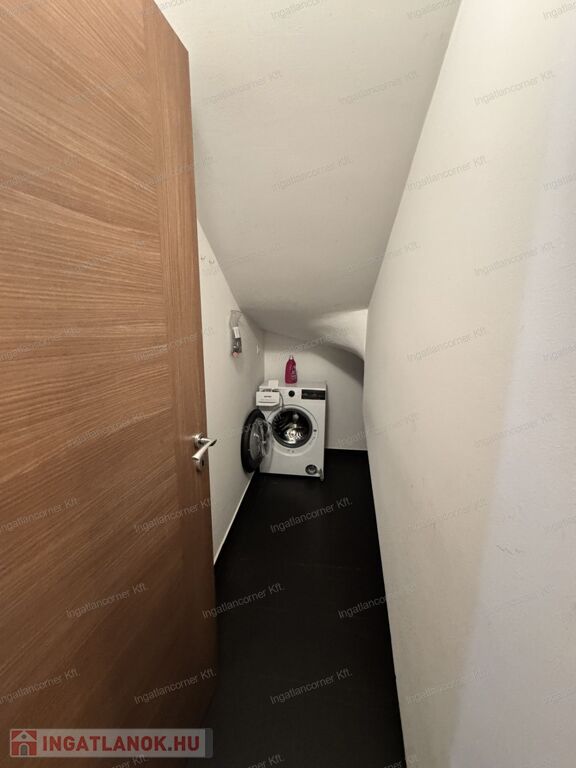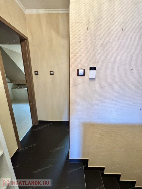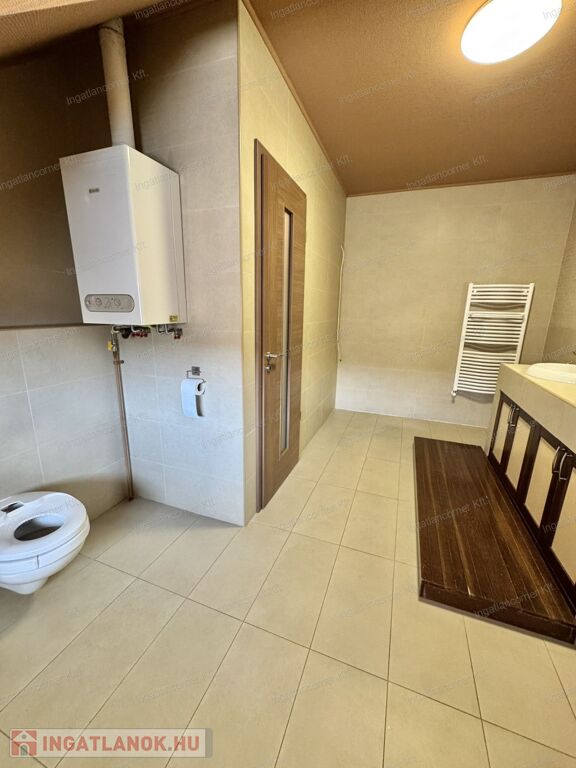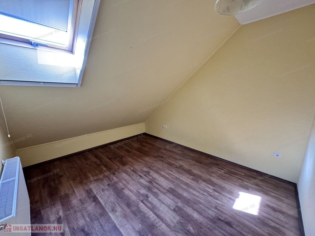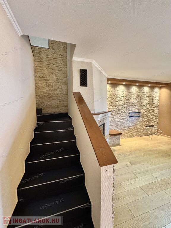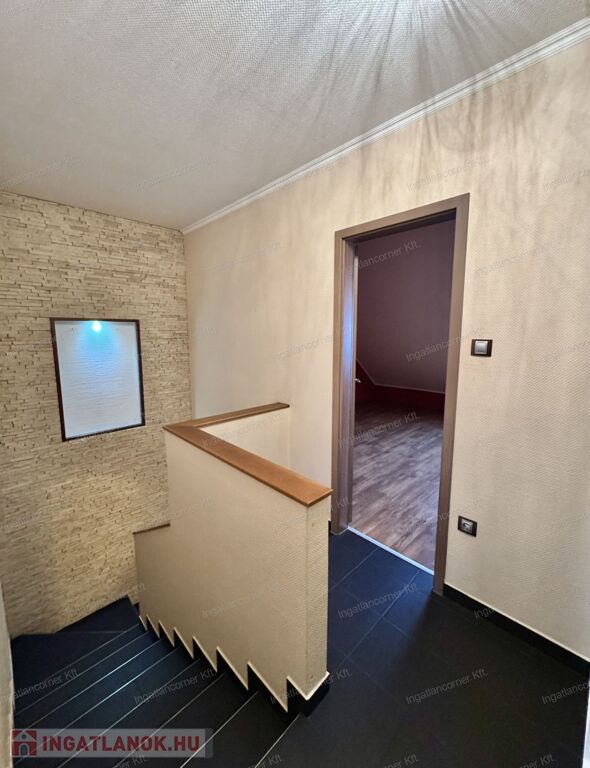 Az alsó szinten található az előszoba, zuhanyzó wc-vel, 17,7 nm-es hálószoba, kamra, am-konyha-nappali. A nappaliból egy üvegajtón keresztül léphetünk ki a 16 nm-es teraszra, amely a hátsó kertre nyílik. A felső szinten 2 hálószoba, gardrób, és egy nagy méretű fürdőszoba WC-vel (korábban hatalmas kád volt, illetve szauna bekábelezve) kapott helyet. A nappali – konyha – étkező összesen 41 nm. A padlástér ki lett alakítva, pakolható.