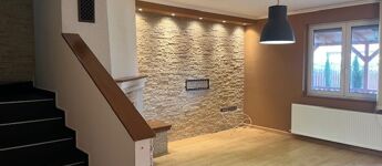 A nappaliban kandallón és a lépcsőfeljárónál elegáns kőburkolat díszíti a falakat.