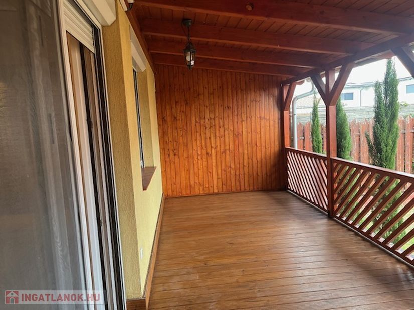 Elosztása a földszinten:-előtér, közlekedő, fürdőszoba, 1 szoba, tároló, amerikai konyhás nappali,fedett terasz (10 nm)