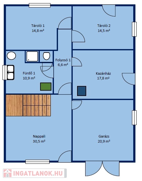A házhoz tartozik 2 melléképület (44 és 45 m2) illetve egy gyümölcsös (350 m2) is.