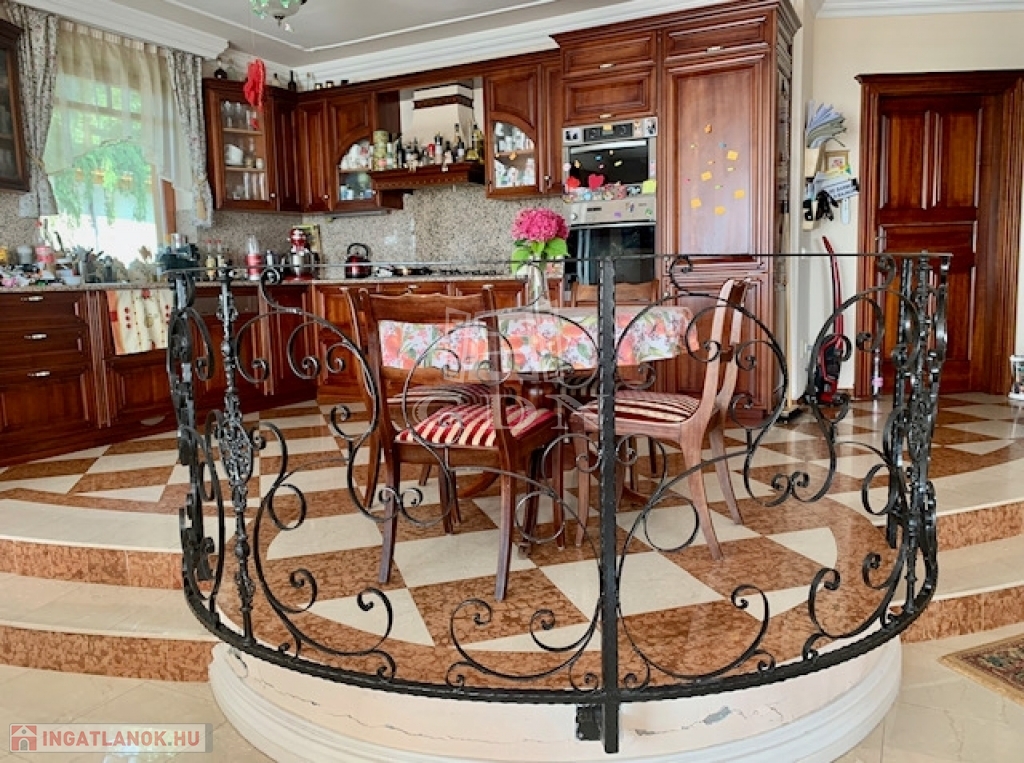 A szépen parkosított öntözőrendszerrel ellátott, geotextíliával és mulccsal fedett kertben 40 négyzetméteres téliesíthető fedett konyha lett kialakítva, kemencével, gránit pulttal, mosogatógéppel és minőségi berendezéssel.