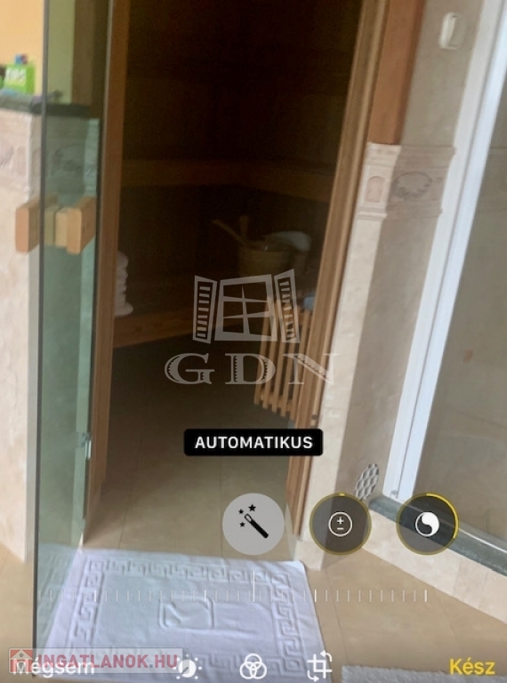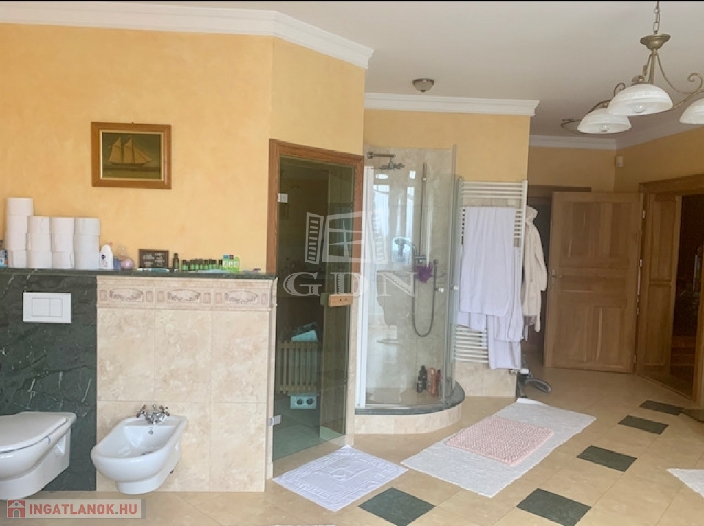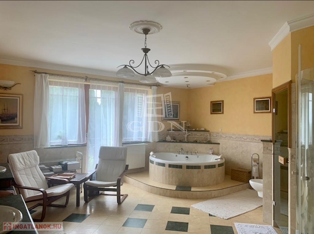A nagy méretű erkélyes fürdőszobában vörösfenyőből keszült 6 személyes szaunát, valamint jacuzzit is találunk.
