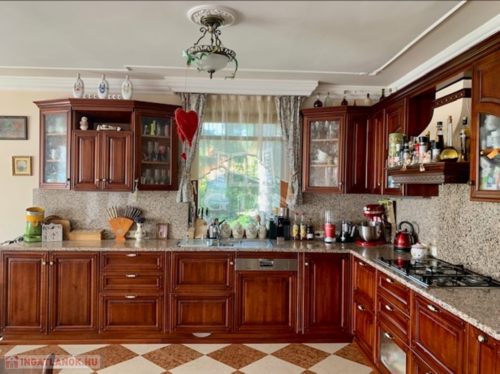 A 8 méteres L alakú konyha cseresznyefából készült, Miele sütővel, gőzpárolóval, mosogatógéppel, páraelszívóval, Blanco mosogatóval és gránit pulttal.