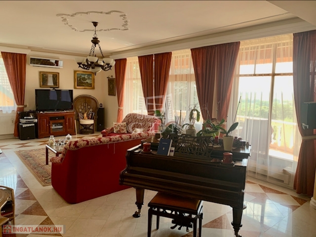 A házba belépve szintén ízléses, esztétikus magas minőségű kivitelezéssel és berendezéssel találkozunk. A beltéri ajtók cseresznye és tölgyfából készültek, a nappaliban a burkolat márvány (Verona rosso és Botticino), melyet igényes gipsz stukkó és rejtett világítas egészít ki.