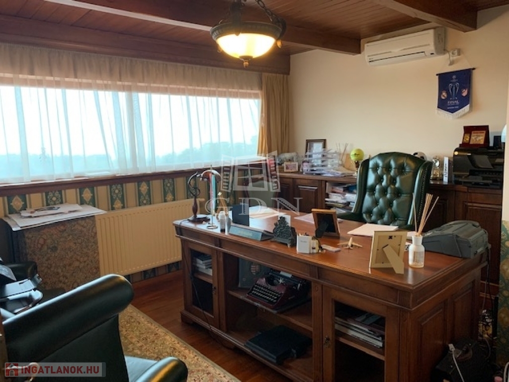 A legfelső szinten impozáns irodahelyiség talalható tölgyfa padozattal és mennyezettel, igényes berendezéssel.