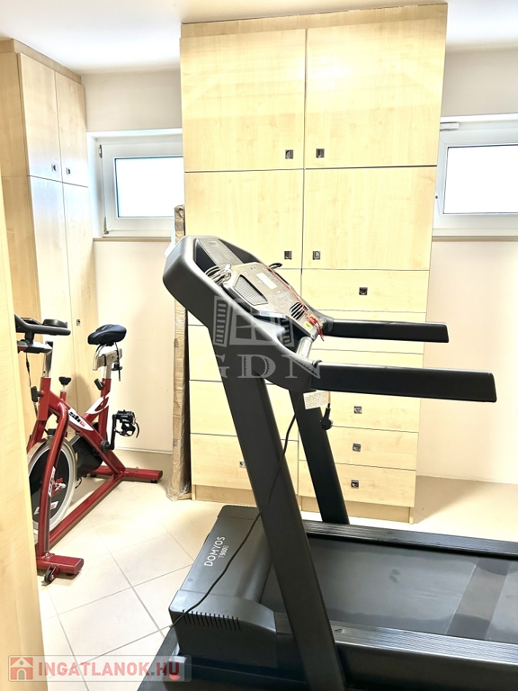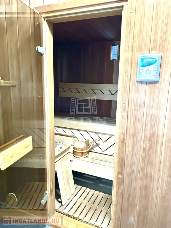 Pinceszint: előtér, szauna, hozzá tartozó zuhanyzó, különálló wc, konyha, folyosó, gardrób szoba, kondi terem, és egy világos nagy szoba.