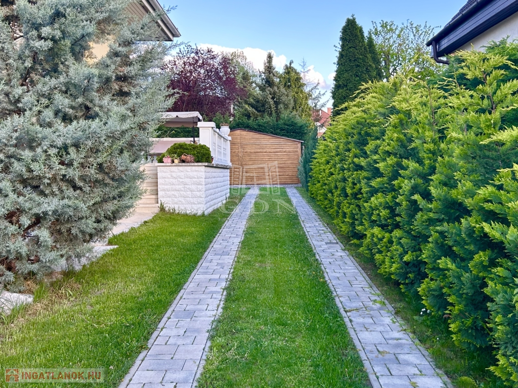 A kert rendezett, gyönyörű kiegészítője a háznak. A növények vízellátását öntözőrendszer biztosítja.