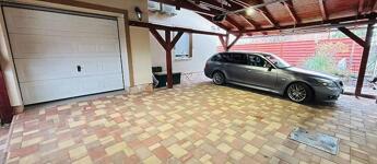 A parkolás teljes mértékben megoldott: az 50 m²-es, fedett viacolor beállón akár három autó is kényelmesen elfér, a garázs elektromos, 8 méter széles szekcionált kapuval felszerelt, a ház előtt pedig további két parkolóhely áll rendelkezésre. A napelem és hőszivattyú kiépítése előkészítve, a H-tarifa igénylése folyamatban, a puffertartály már beépítésre került.