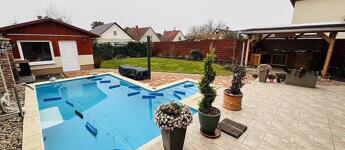 A hátsó kert igazi privát wellness- és pihenőzóna. Az 50 m²-es fedett teraszról egy 7,5 × 3,5 méteres, 1,6 m mély, kiváló felszereltségű fűthető medencéhez jutunk, mely ellenáramoltatóval, automata vegyszeradagolóval, vízlágyítóval, valamint nyak- és hátmasszírozóval is rendelkezik. A gépészetet egy külön, 25 m²-es melléképület rejti, ahol egy szauna is kialakításra került A kertben ezen kívül fedett kerti sütögető is szolgálja a maximális kikapcsolódást.